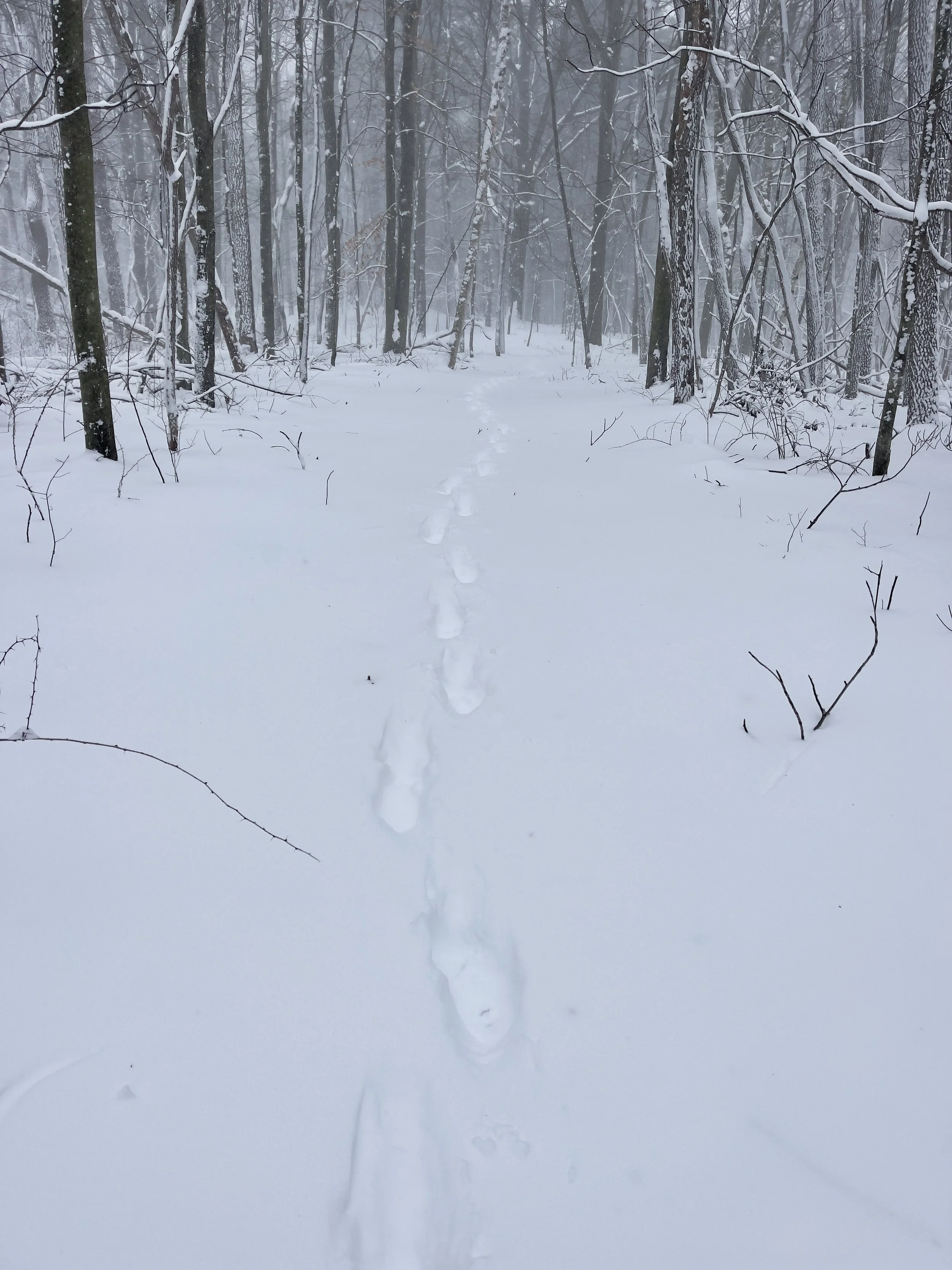 My footprints were the first, even before the deer this morning. The snow blanketing every little thing made snow creatures out of twigs and ivy.