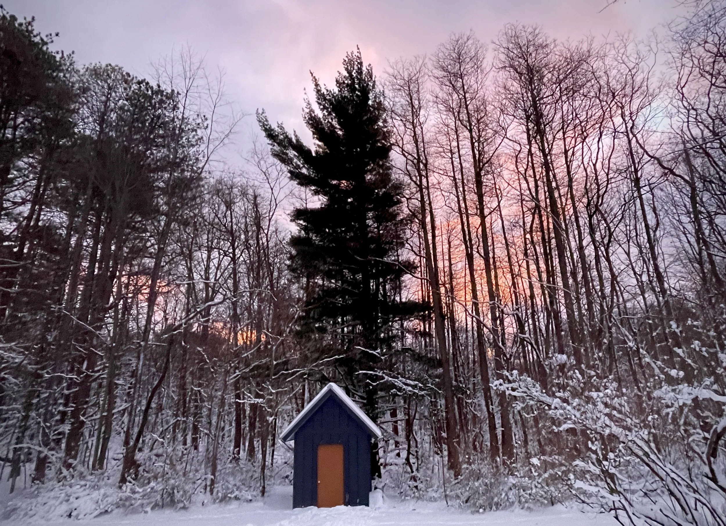 Tuesday morning after Christmas, the sun returned. It filtered through the trees in pinks and purples at first light, then set in a blaze of fiery glory in the evening. It looks warm, but if you look closer, there is ice forming on the lake.