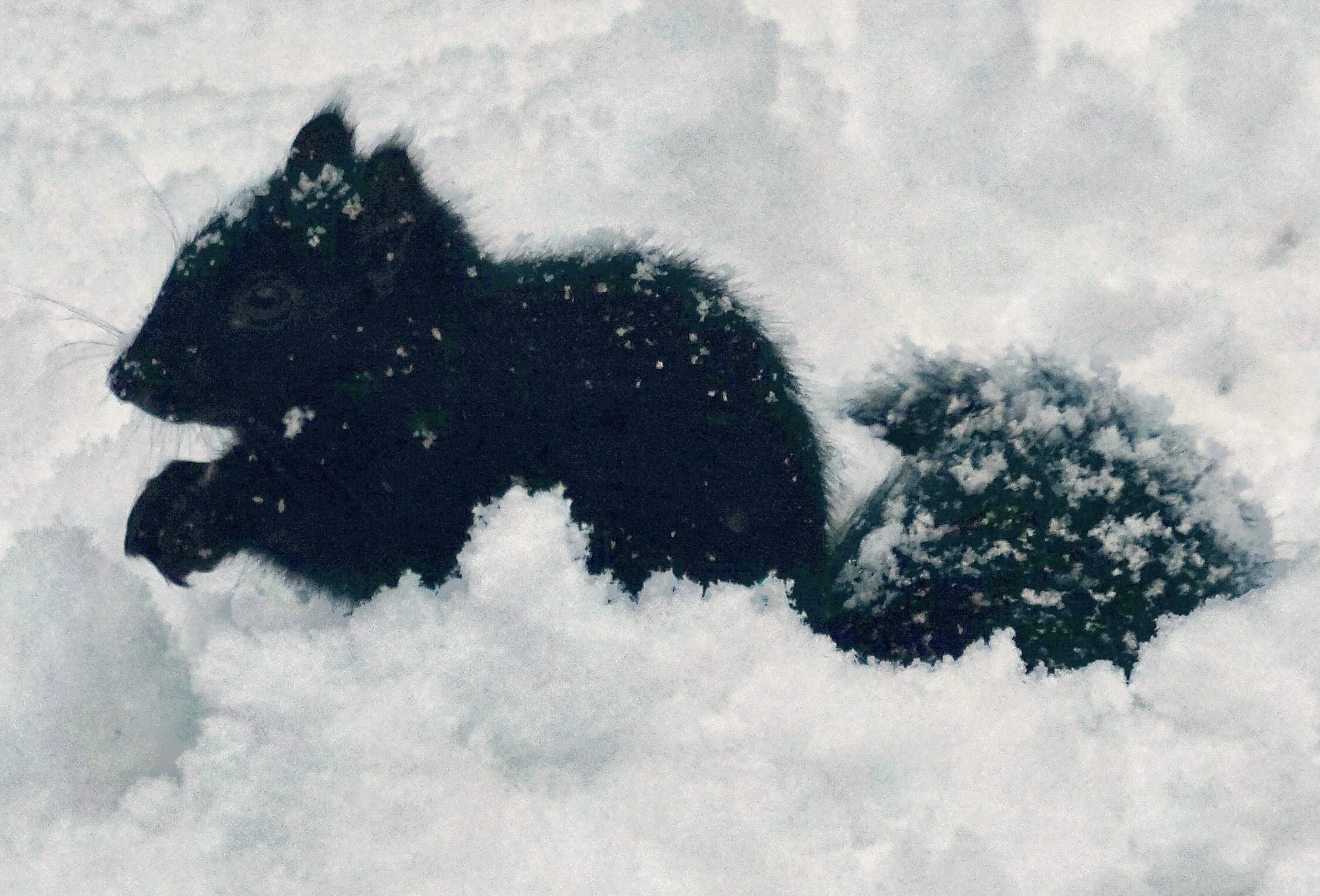 Christmas Day was a little warmer than the previous few days, and the squirrels, who had been hiding up in their nests, came down to get some food beneath the bird feeders. This little black squirrel is shivering while he eats.