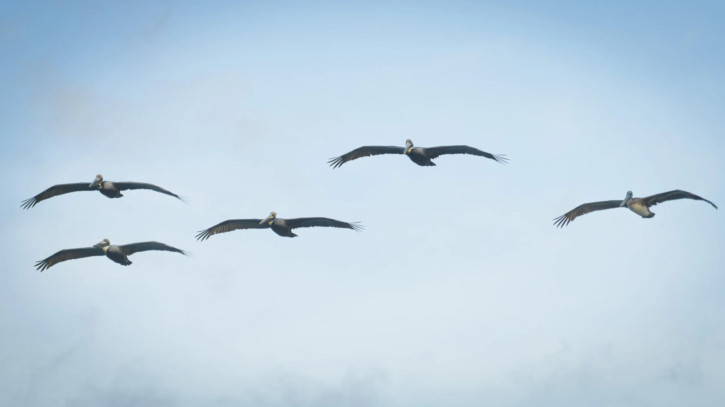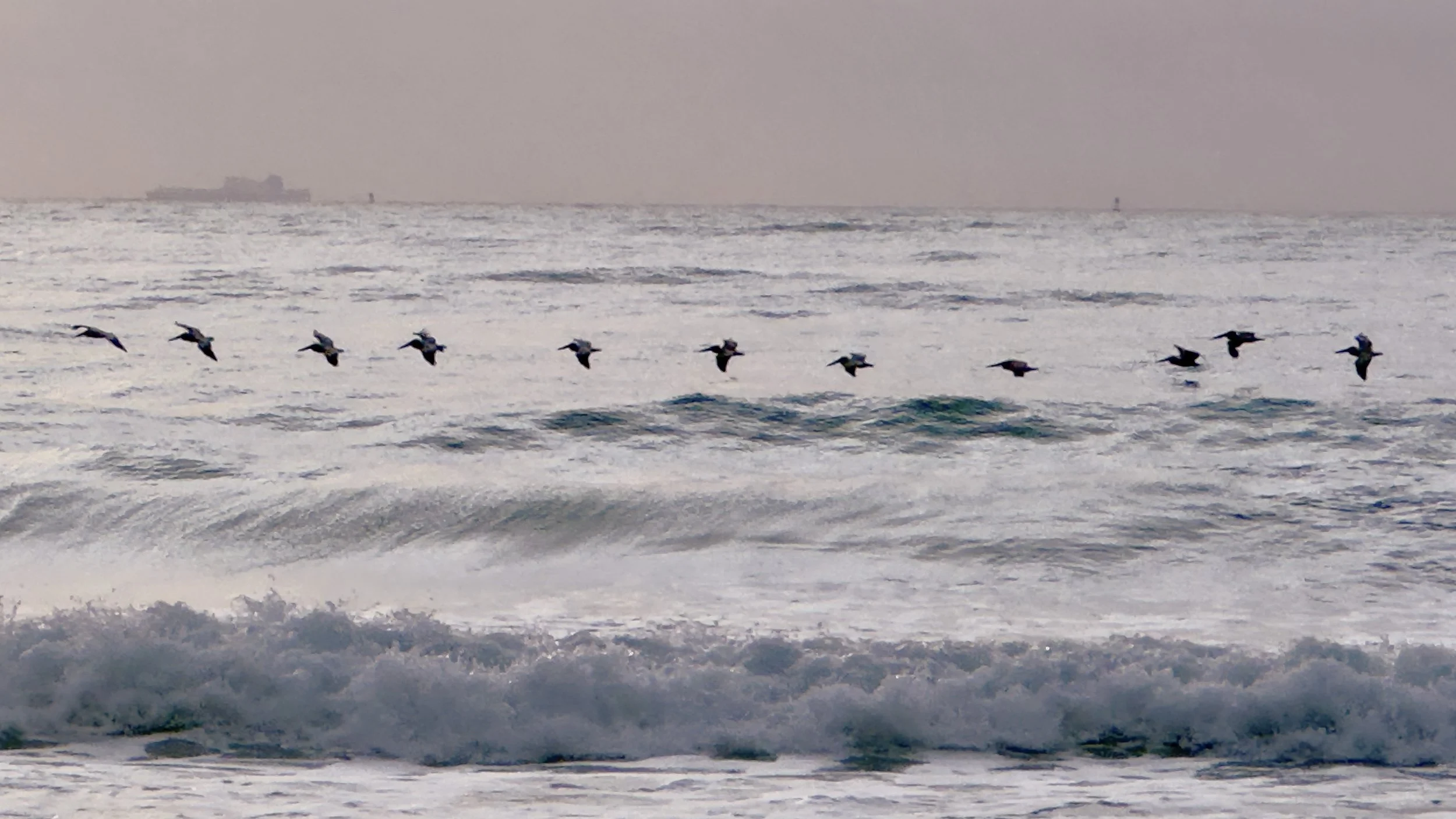 A line of pelicans flying close to the surface to spare their wings some effort.
