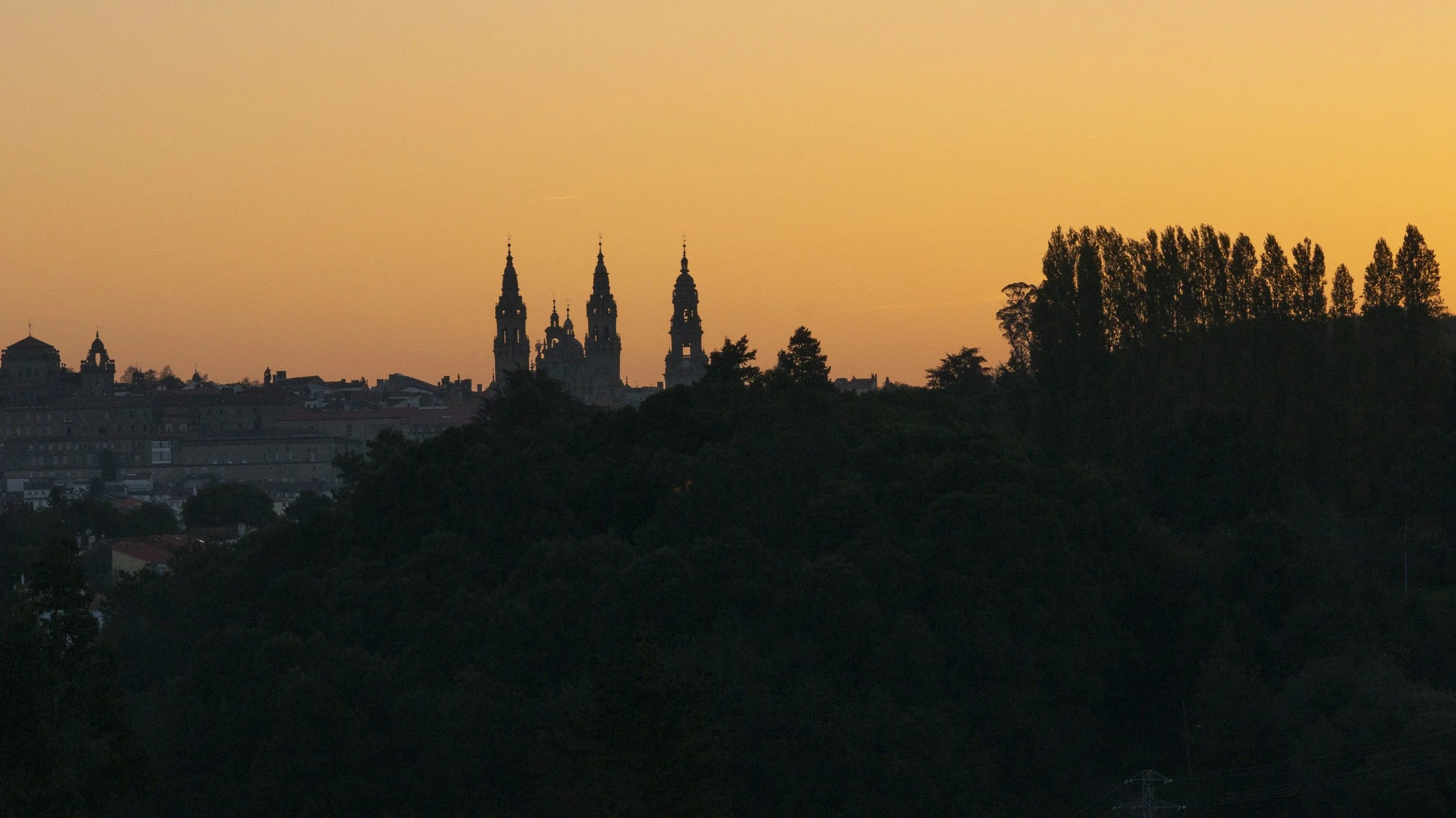 On the 6th day, we walked back to the town from our hotel on the outskirts of Santiago, back to the church to get a tour of the Cathedral and its Museum. The sun was just beginning to crest over the trees and the old part of the city in the distance.