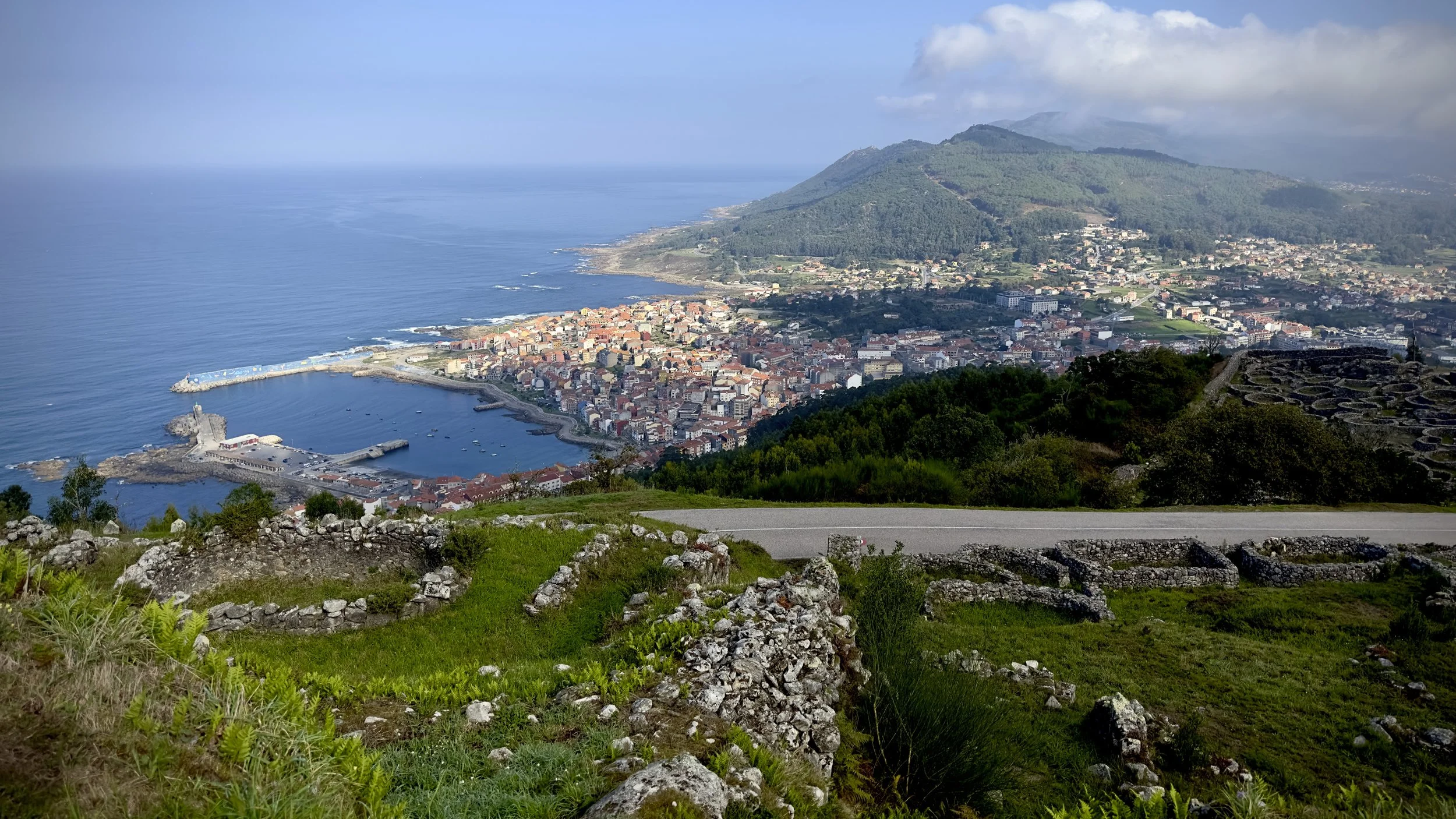 the ancient ruins overlook the more modern fishing town of A Guarda below