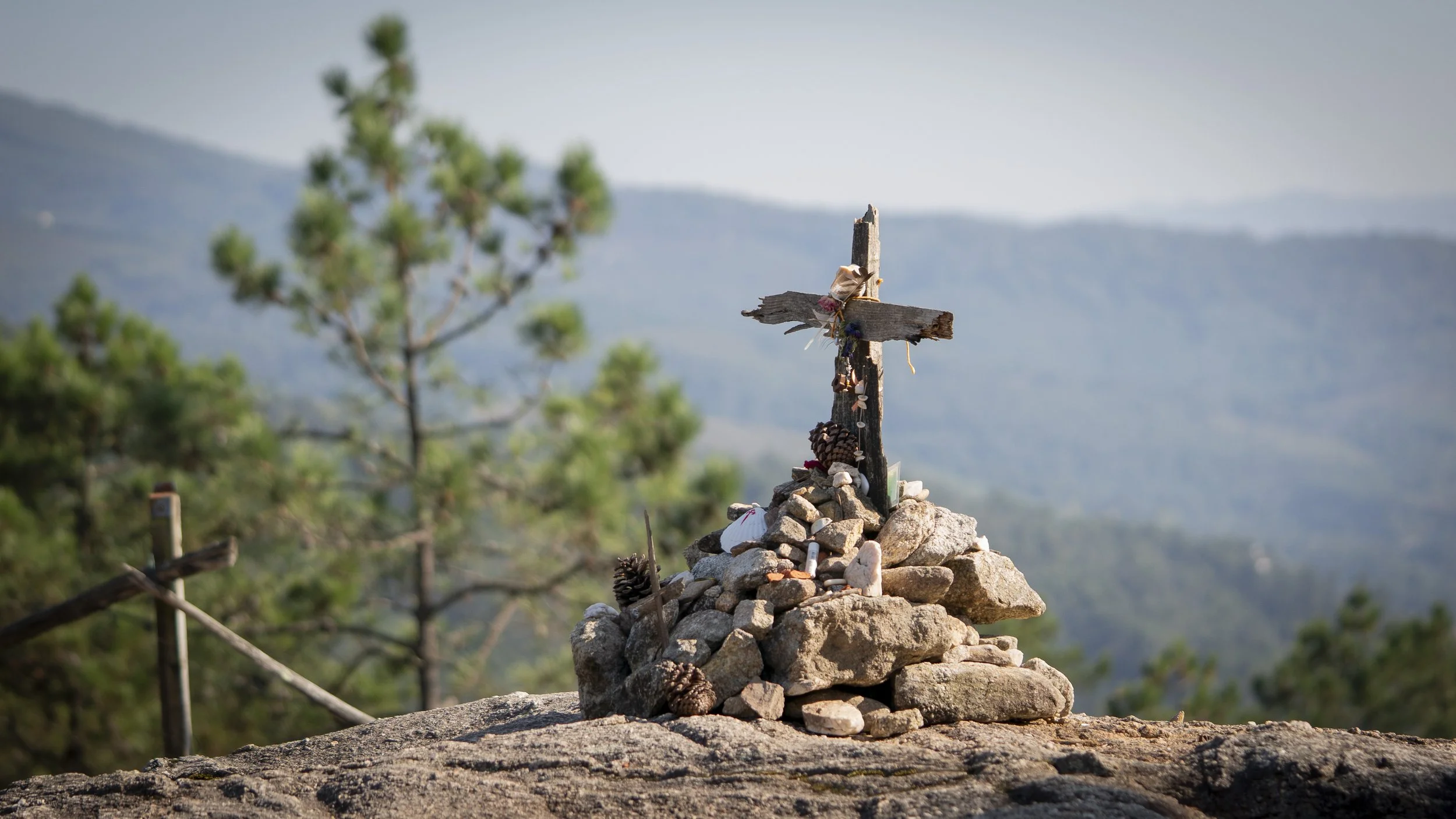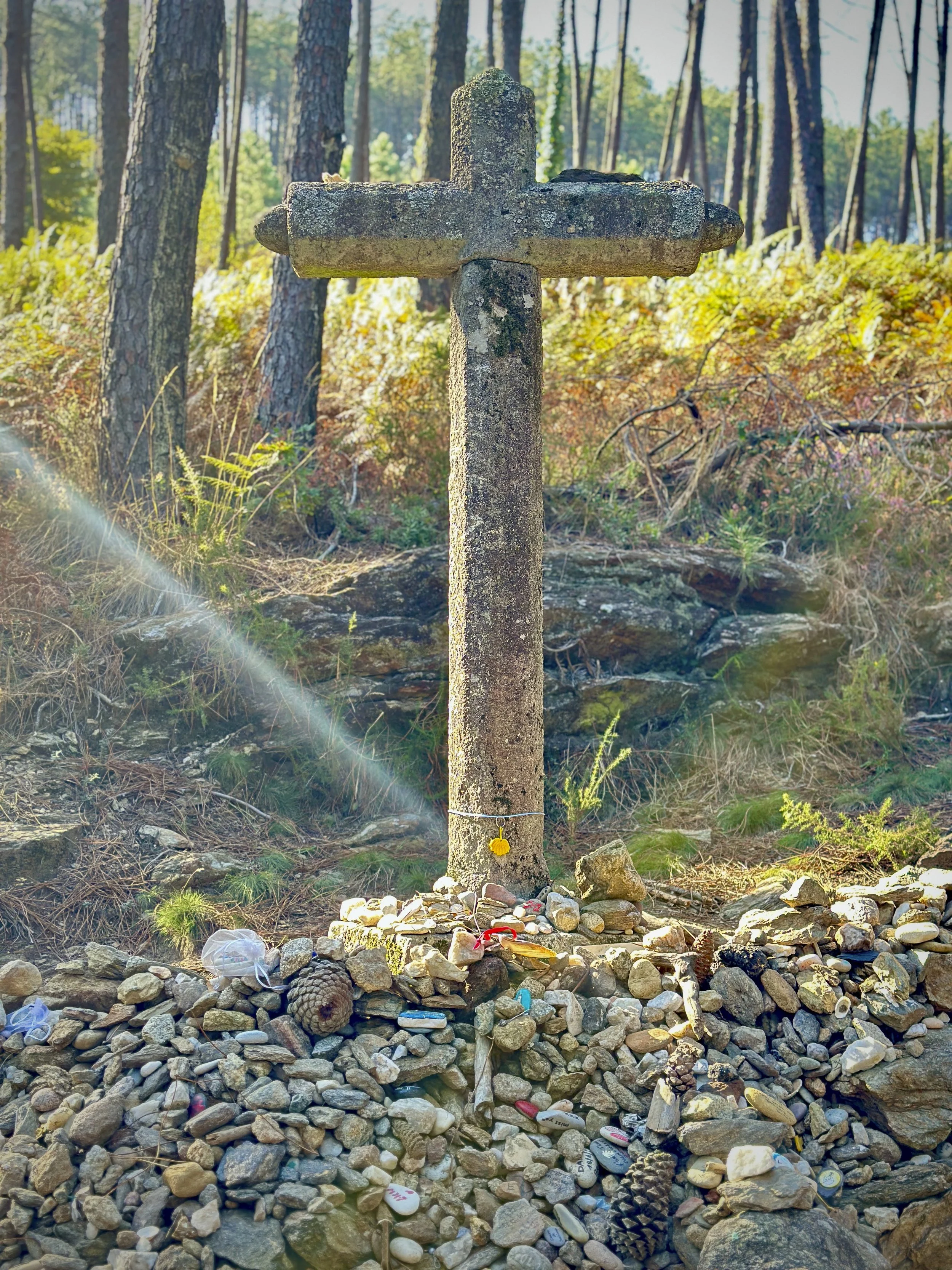 A humble pile of stones and a cross made of broken limbs where pilgrims symbolically lay down their burdens
